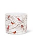 This white planter features a wintry forest scene of a flock of cardinals perched amidst the branches.