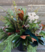 This popular design features a stunning mix of fresh cedar, pine, fir, magnolia, and more—beautifully arranged around wintry white birch stems, dogwood, and curly willow.