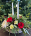 Create a festive, traditional holiday centerpiece featuring lush evergreens, vibrant red roses, cheerful carnations, winter berries, and elegant taper candles.