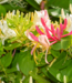 'Goldflame' is a vine flushed deep pink on the outside, opening to reveal orange-yellow throats.